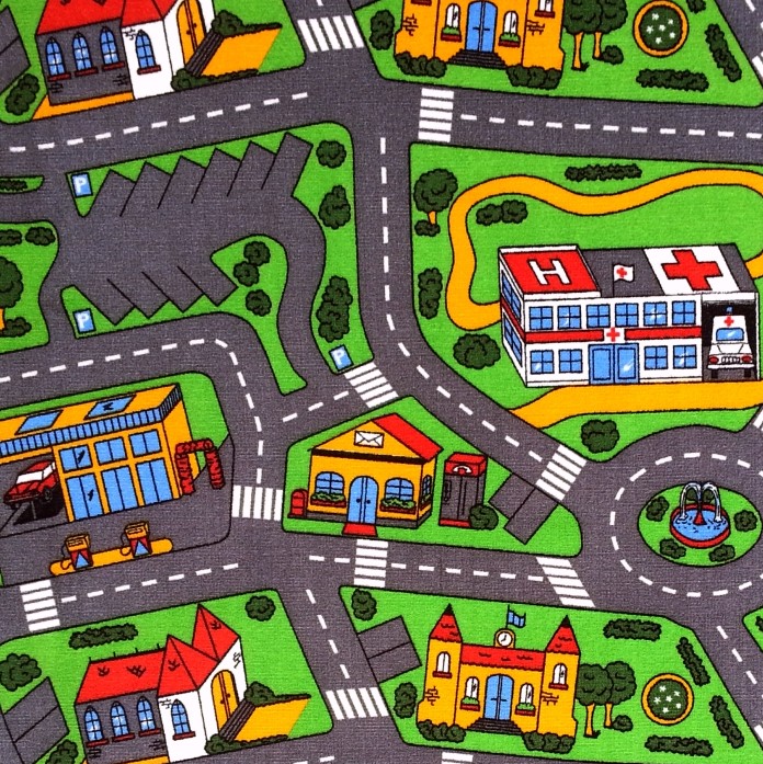 Dětský koberec CITY LIFE je vyroben ze 100% polyamidu v úpravě potištěné nizké smyčky.